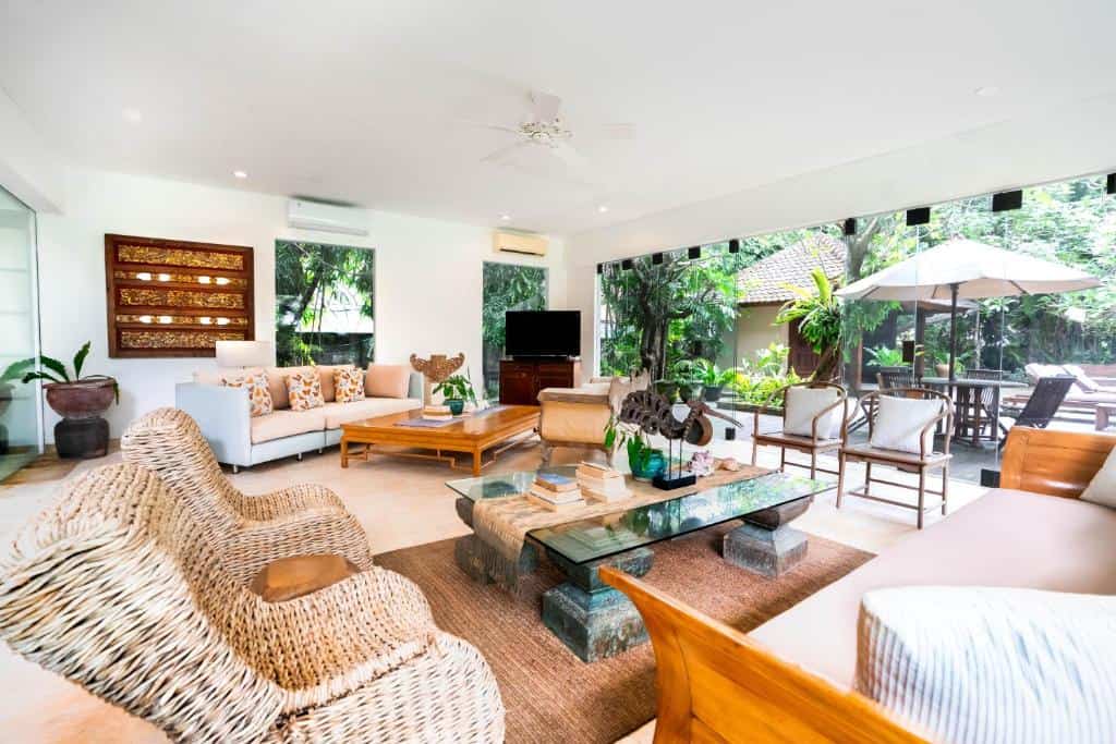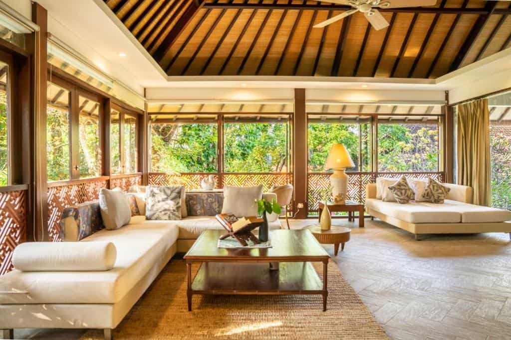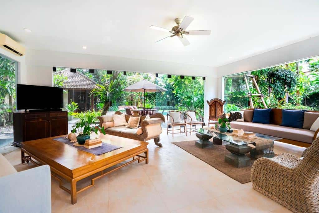A spacious living area with comforting seating and full-height glass doors that frame lush garden and pool views.
