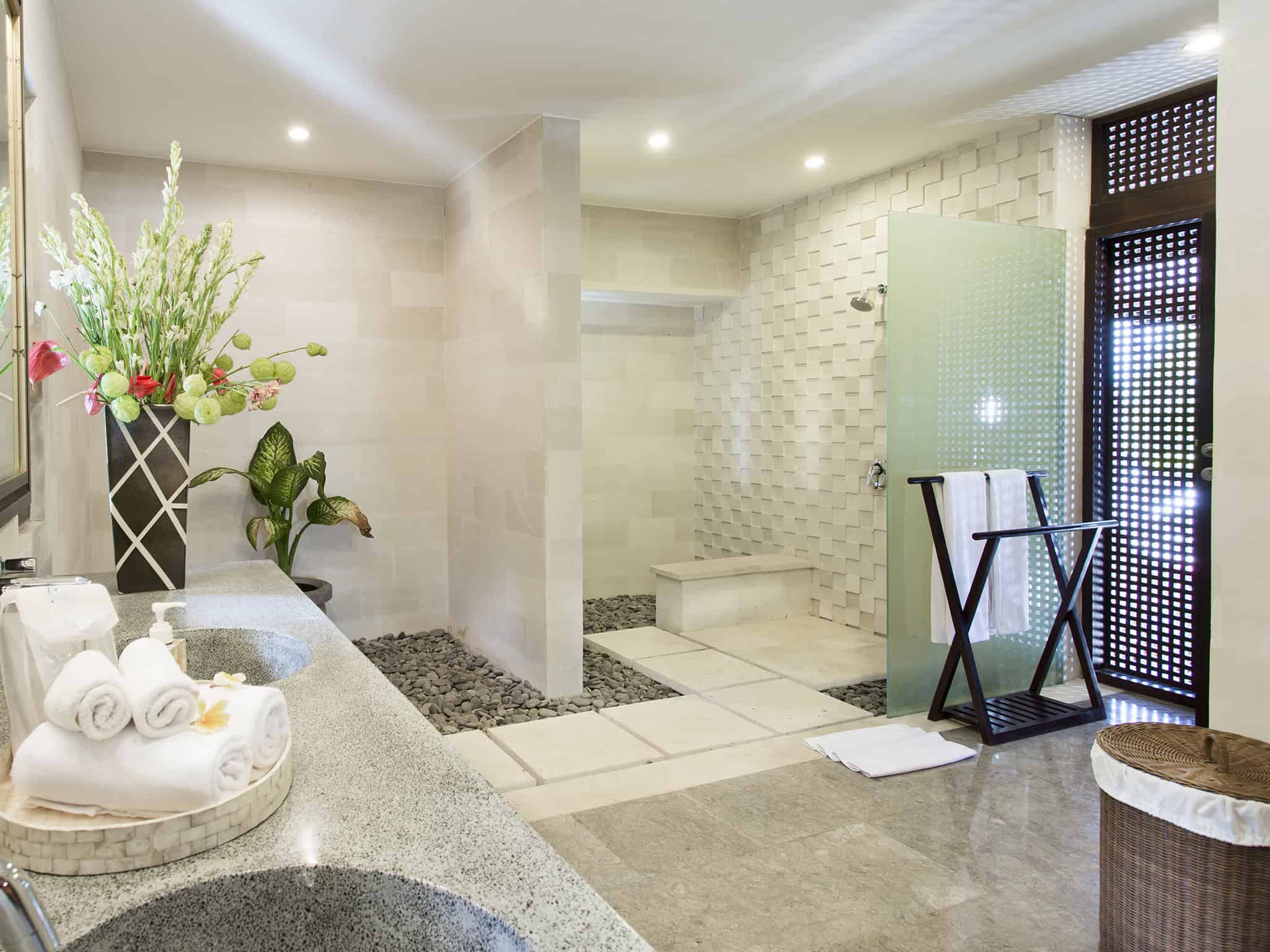 The villa’s two air-conditioned guest bedrooms are on the ground floor. Of a similar size and layout, each is furnished with a queen-size bed topped with embroidered cushions and one features a small, pebbled courtyard garden. Both have semi-outdoor ensuite bathrooms accented in cream and white stone, with walk-in rain showers.