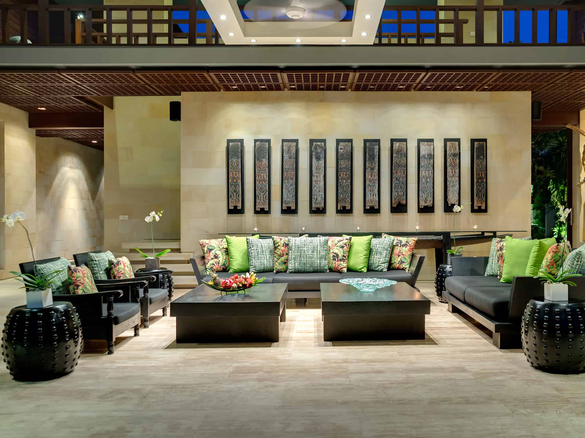 The villa’s living room furniture can be moved to provide more space for guest’s arrivals; however, this area should not be used as an event place. The lower grass area immediately in front of the rice fields is ideally for ceremonies. Dinner tables can be set up around the pool area on the higher lawns; the terrazzo deck by the poolside will make the perfect dance floor.