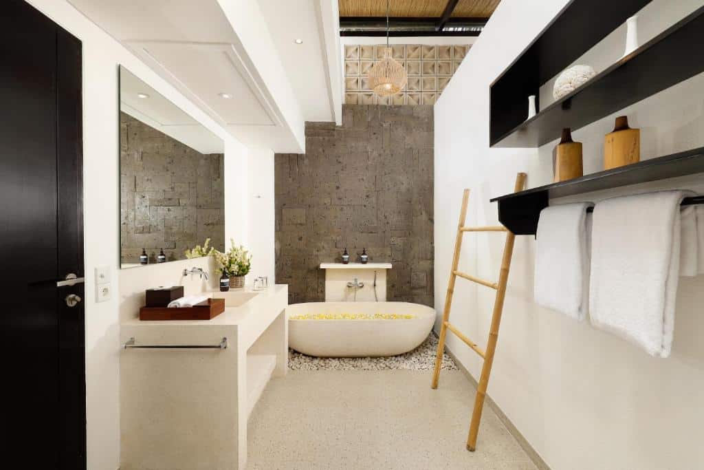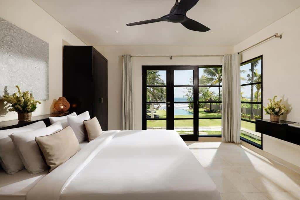 Occupying 1800 square meters of the finest beachfront estate, this swish five-bedroom villa boasts five bathrooms, an outdoor pool, a palatial living and dining room, a contemporary kitchen, a multi-level garden area, private access to the beach, and a sunken outdoor lounge area just steps from the Indian Ocean. Tall palm trees line the outdoor expanse, forming an irresistible green corridor from the front gate all the way down to the beach. Staying in this tranquil sanctuary truly epitomizes the unrivaled Balinese villa living experience.