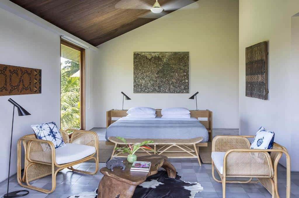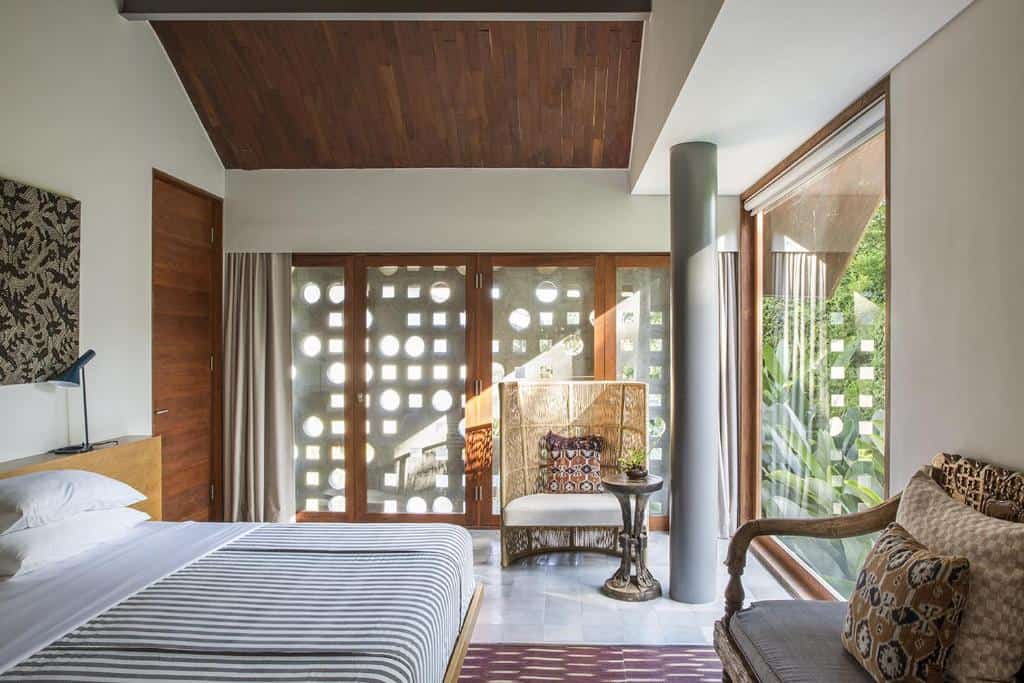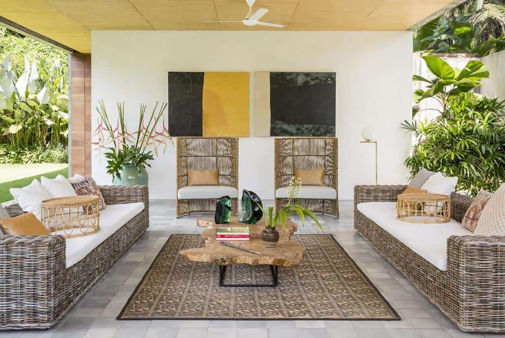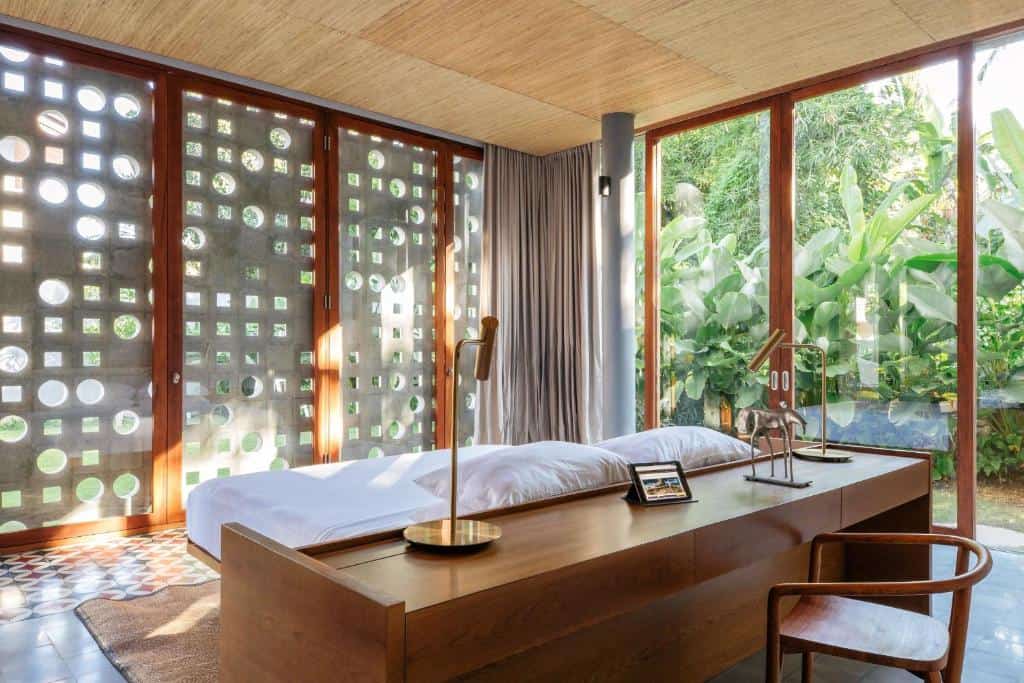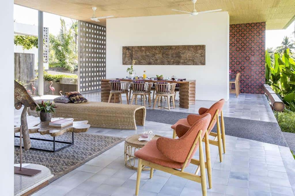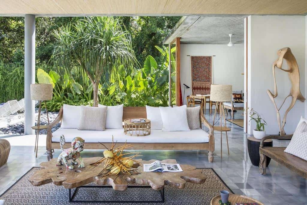 Each villa—whether Rumah Panggung, Panjang, or Sandiwara—features an open-plan living area designed to blend indoor and outdoor spaces. These lounges are elegantly furnished with wooden sofas, plush seating, and artistic décor, creating a serene gathering spot that opens directly onto lush gardens and private pools.