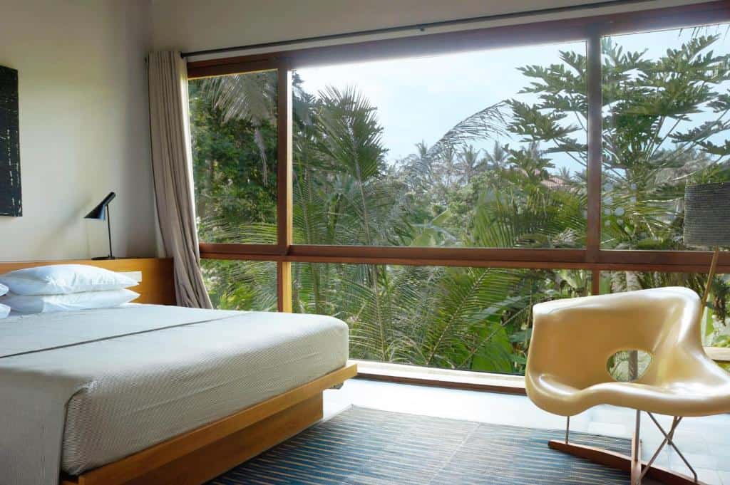 Elevated for ocean views, this villa has living and dining spaces opening onto plantations and the sea. Bedrooms upstairs include a master suite with a private terrace and views of Mount Agung