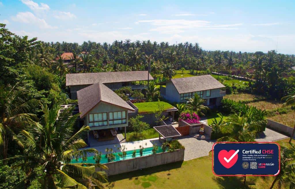 Guests can enjoy a shared gym and yoga space, private plunge pools, media dens, and massage rooms in each villa. With capacity for up to 22 guests, the estate is ideal for weddings, retreats, and extended family gatherings, with easy access to beach walks, the Bali Safari & Marine Park, Ubud, Sanur, and the surf breaks of Keramas.