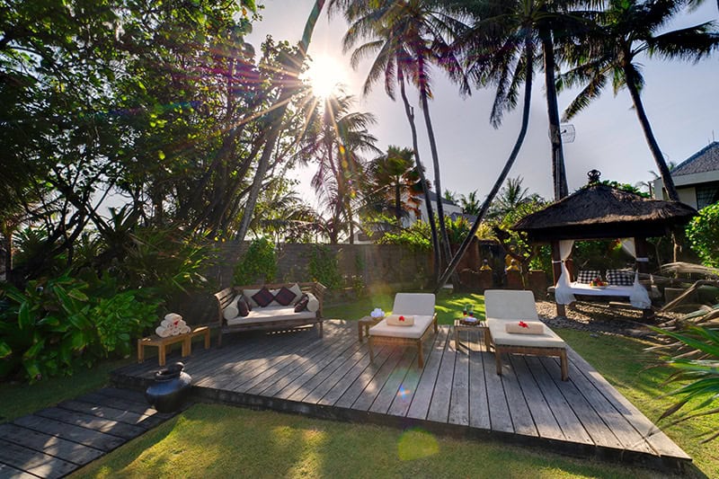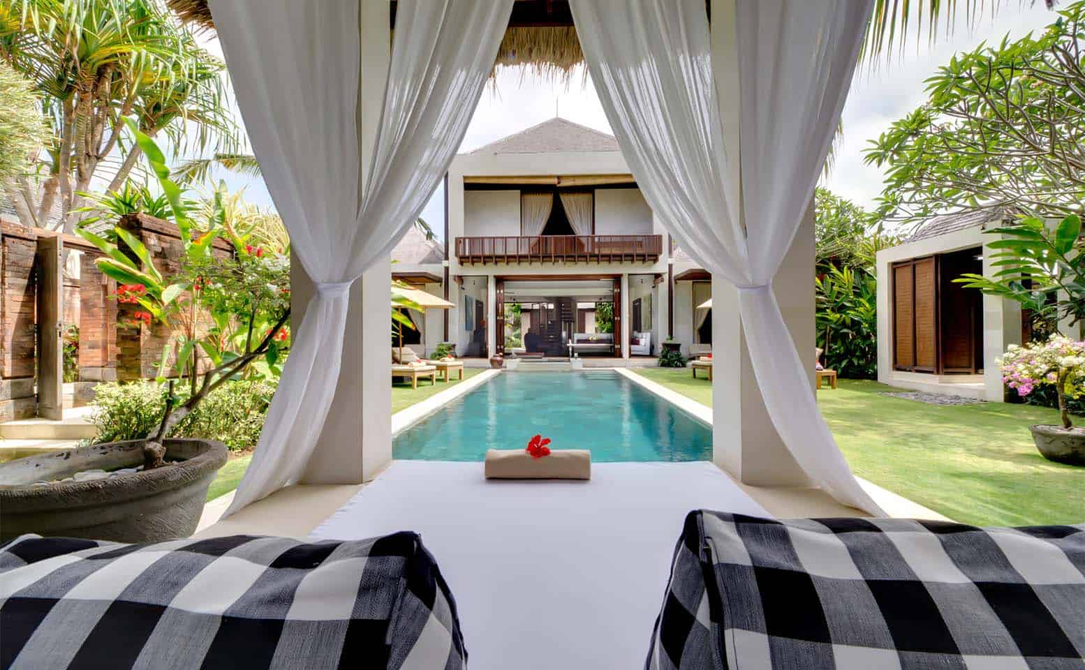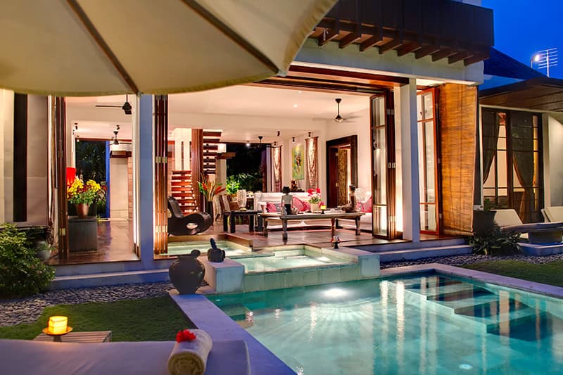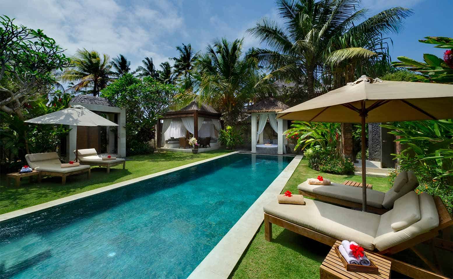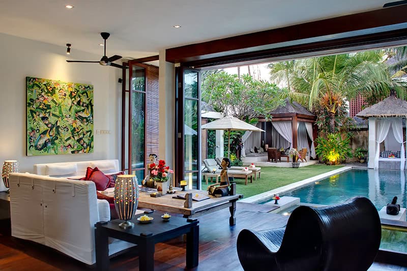 Exuding tropical comfort, Villa Raj showcases a sweeping courtyard with lush lawn and greenery aplenty, an outdoor swimming pool, a bale and has its own private access to the beachfront lounge area. Indoor living spaces are evocative chic mixing hardwood timber panels with elegant furnishings. Selected art pieces large and small feature on walls and elevated surfaces.