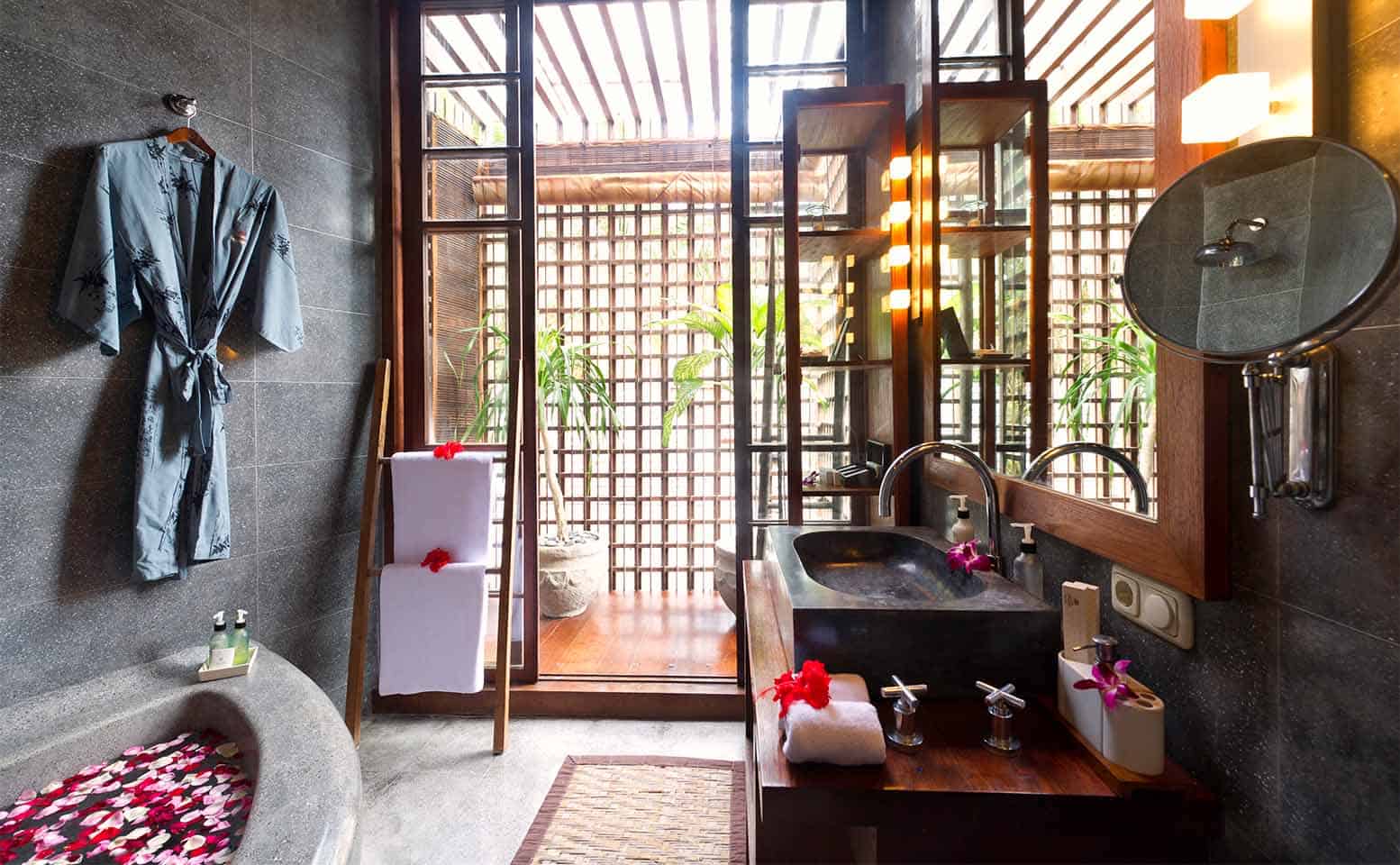The two guest bedrooms downstairs each have a king bed and garden access, with breezy, semi-outdoor en-suites featuring sunken bathtubs, rain showers, and tropical touches.