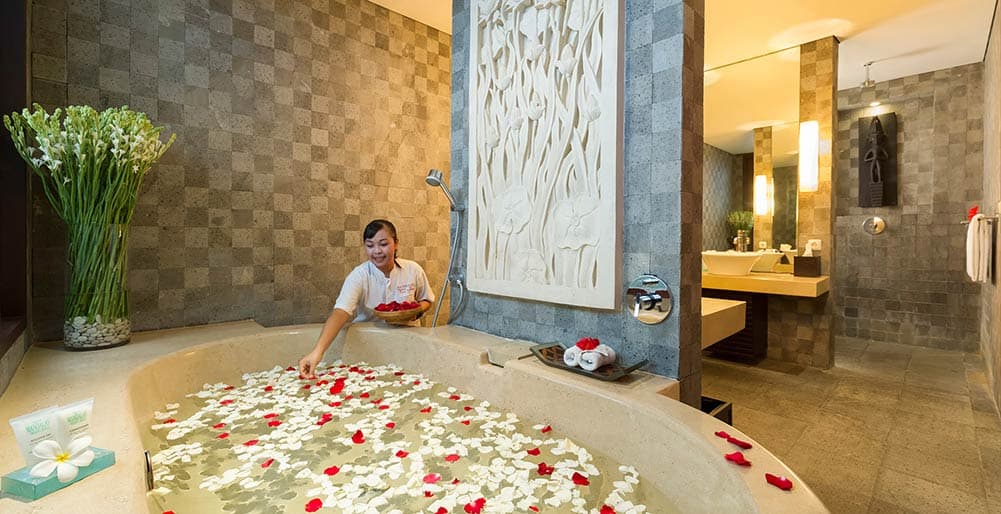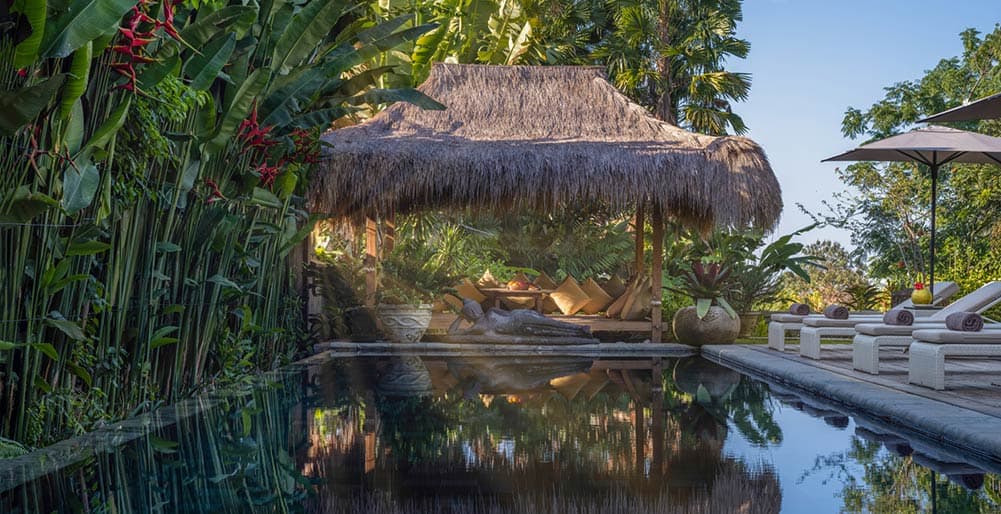 Built as a complex with multiple pavilions, even within each villa, the estate marries traditional architecture with modern facilities. Air-conditioned interiors, private pools, open-sided living spaces and manicured lawns make each villa a private haven. Bali’s tropical weather begs for outdoor living and the villas have been designed to maximize this. Covered patios with comfortable lounge seating, living rooms that open up on one side thanks to sliding glass doors, poolside decks dotted with sun loungers, and a thatched balé in each villa for alfresco meals or relaxing massages, there’s a private corner to be found for each guest staying at Mandalay Villas.