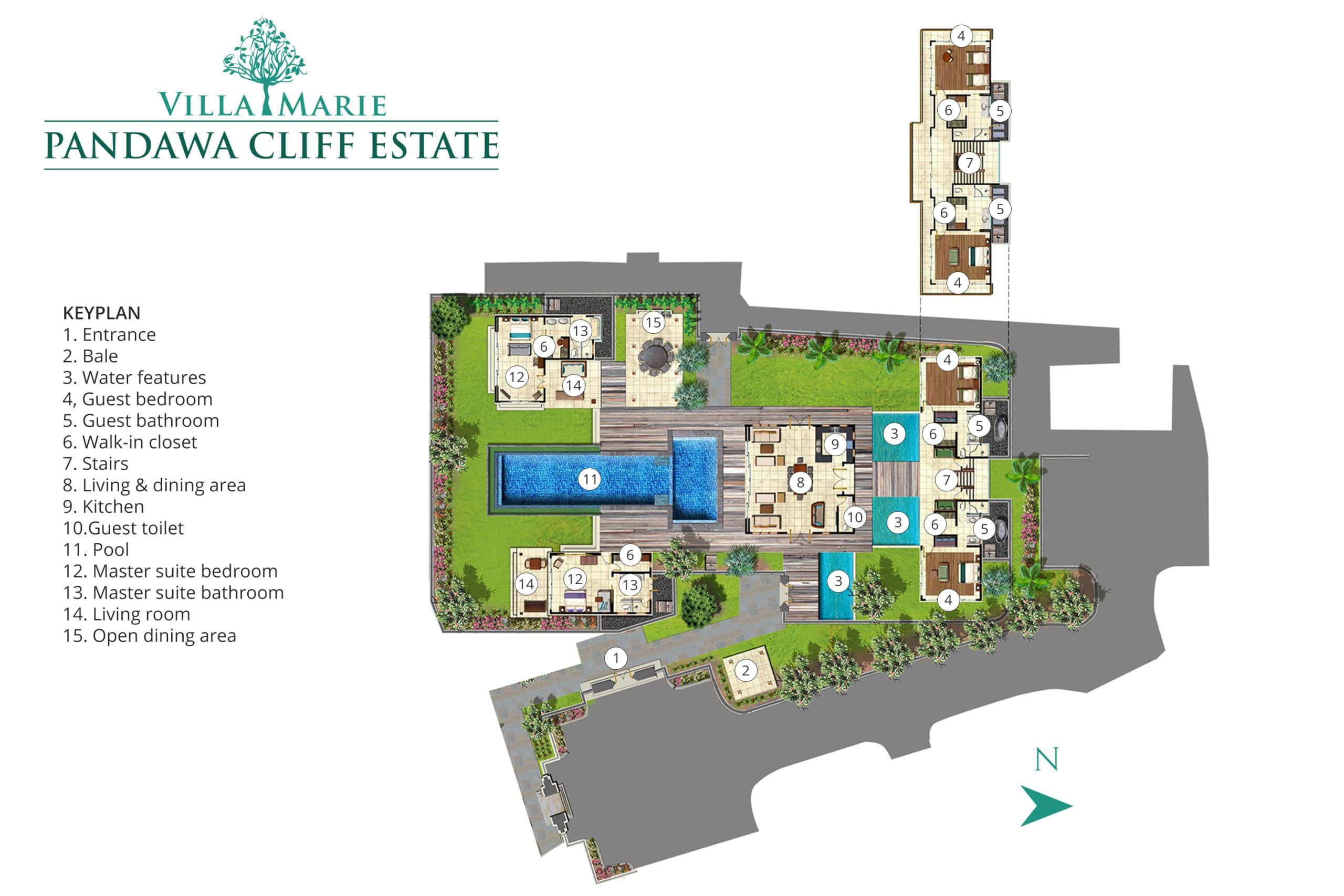 Together, The Pala, Villa Rose, Villa Markisa and Villa Marie offer a total of 21 bedrooms, capable of sleeping 42 adults. This, coupled with the superbly landscaped cliff top gardens, extensive decked areas, huge team of professional yet personable staff and purpose-designed guest facilities, make The Pandawa Cliff Estate a wedding and special event venue par excellence. The four villas also share a sports center with a full-size tennis court, squash court, gym and spa.