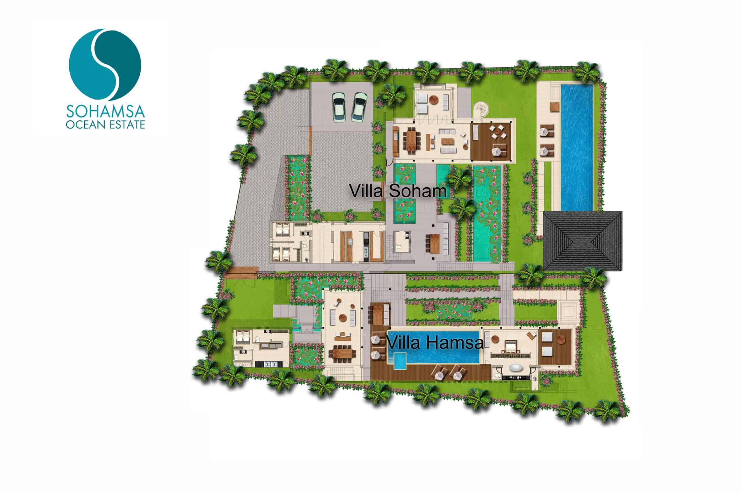 Villa Soham: 1,915sqm (land); 1,309sqm (villa). Villa Hamsa: 1,064sqm (land); 883 sqm (villa).