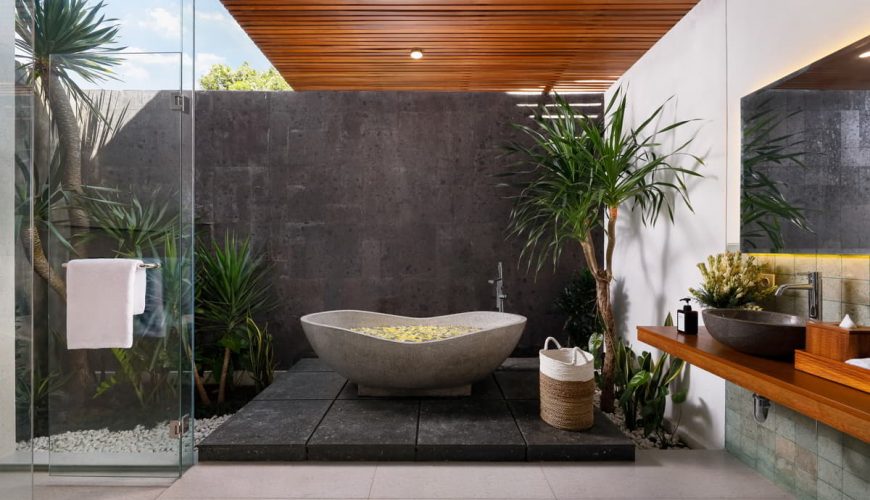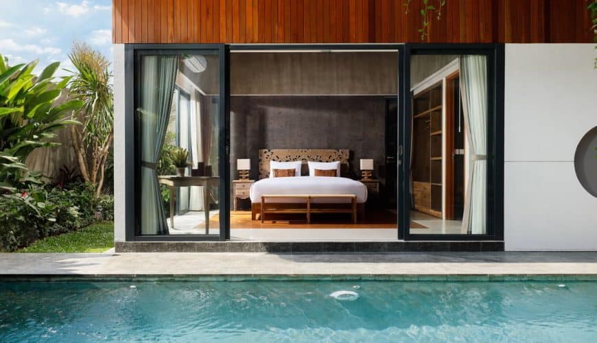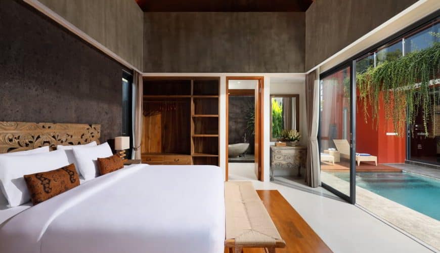 The master bedroom occupies an entire pavilion and features a queen bed, direct pool access, and a spacious semi-open en-suite with a standalone bathtub.