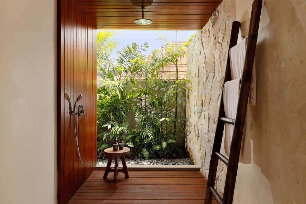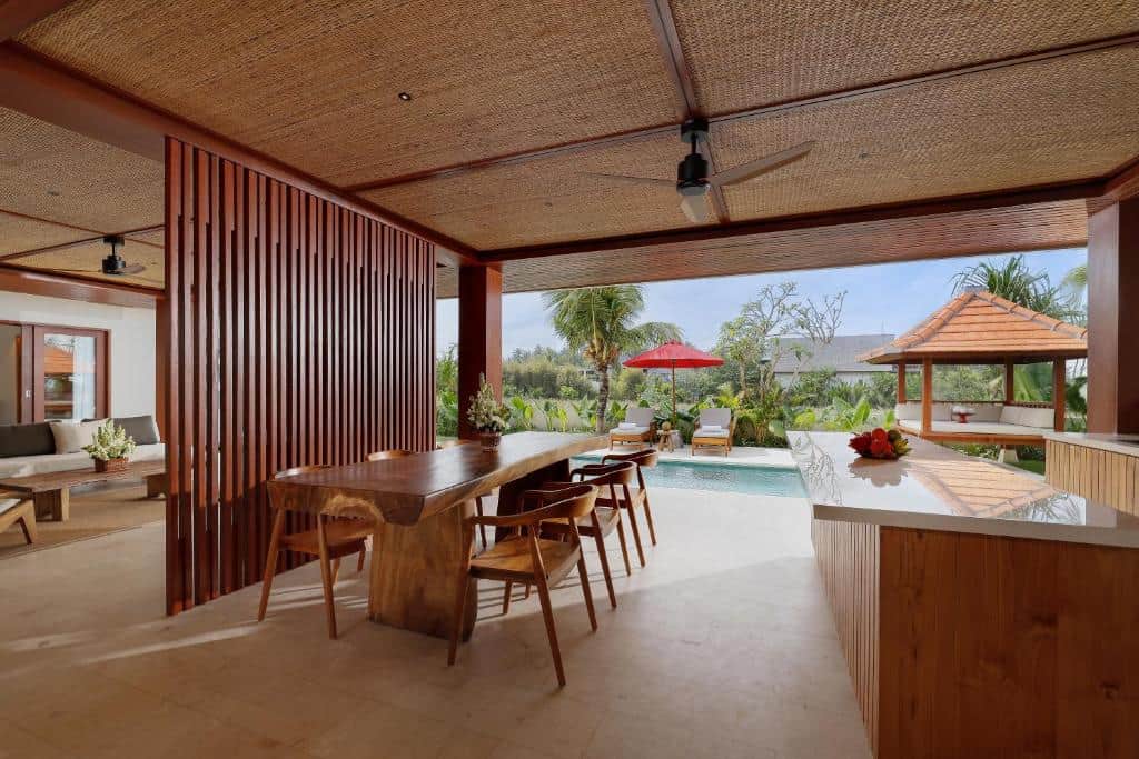 The Villa boasts spaciousness, its semi-outdoor living area overlooking a glimmering private pool, the village’s lush local vegetation, and tranquil tropical gardens with a gazebo.