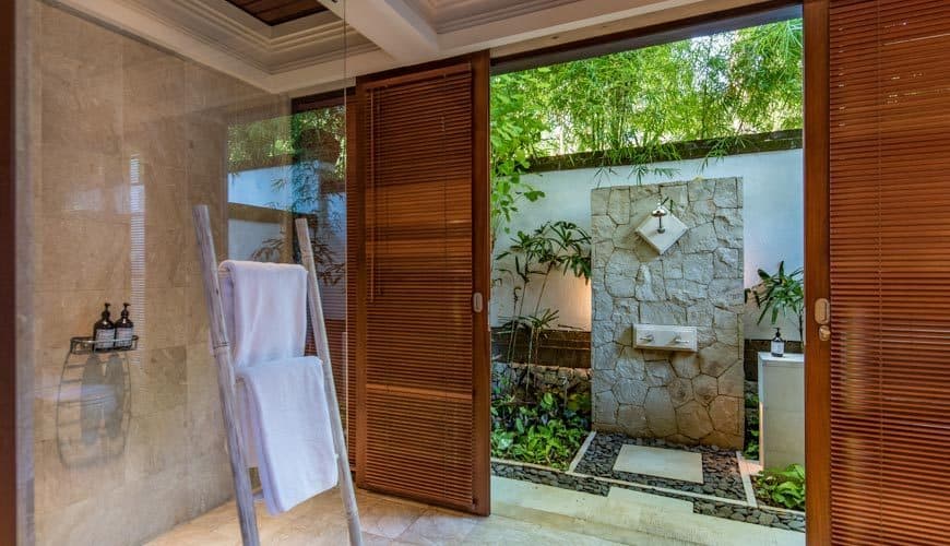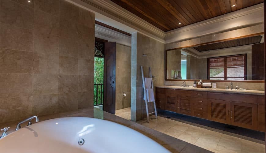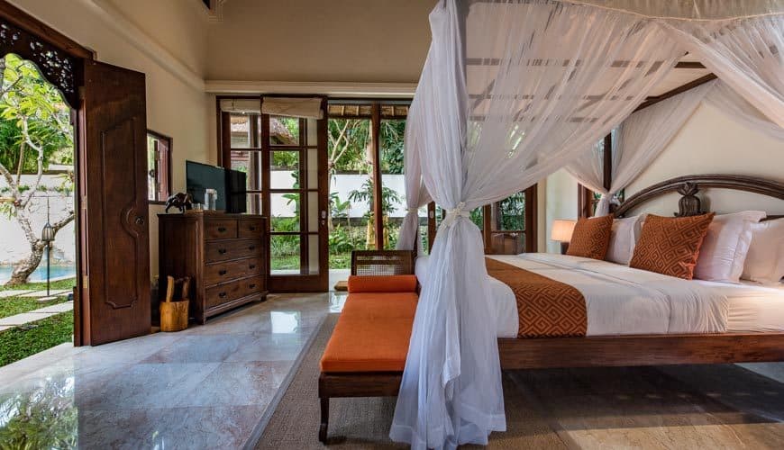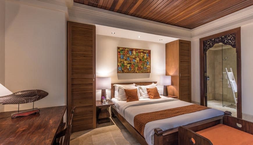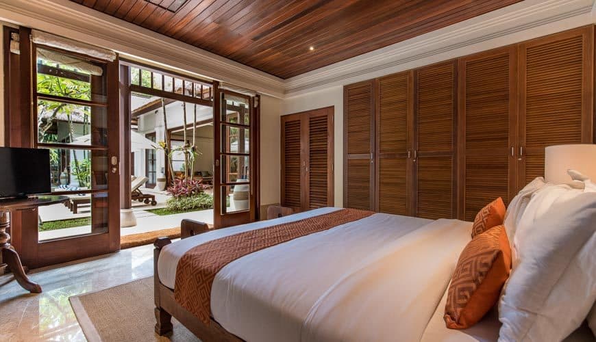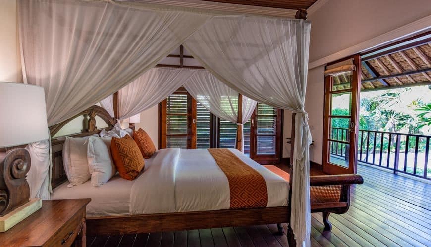 Villa Senada houses 4 bedrooms. The master suite resides up on the first floor of the double-storey guest house pavilion, adjoined to a balcony.