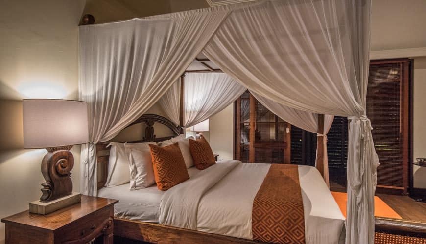 The spacious bedroom is furnished with a romantic canopied king-size four-poster bed, a lounge bed and a TV. There is a walkthrough dressing room featuring large timber wardrobe closets and it leads to the en-suite bathroom where you can enjoy a hot shower or a bath.