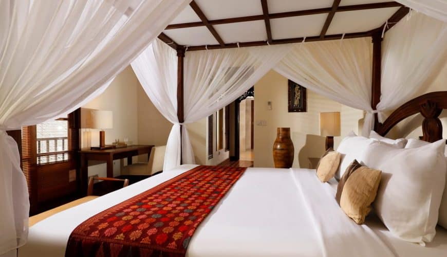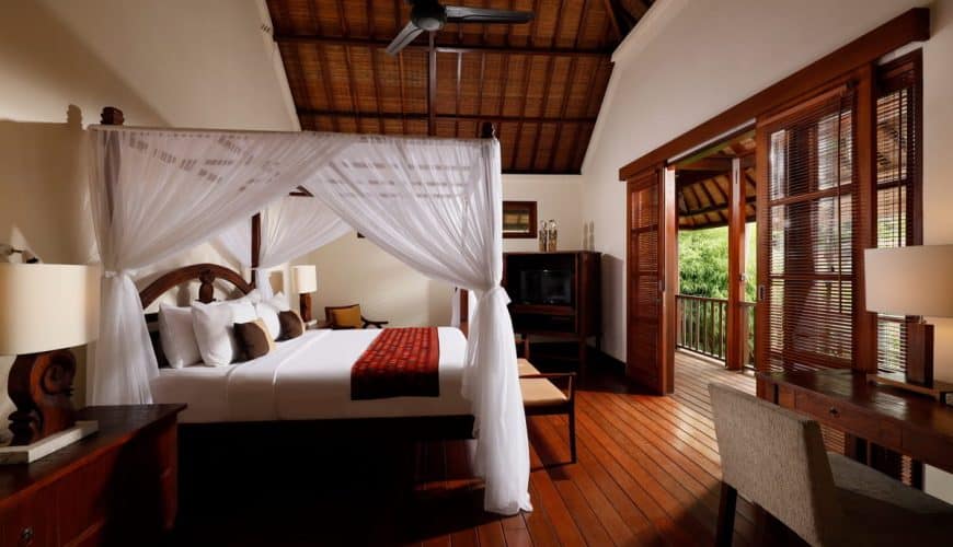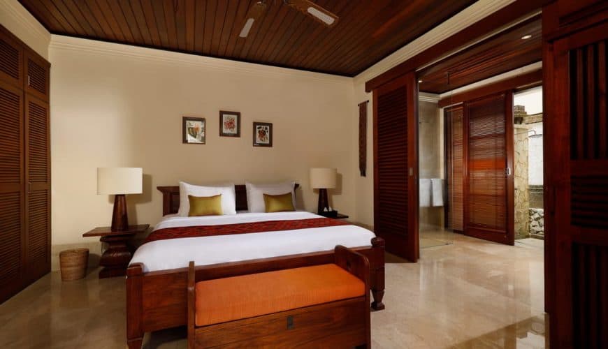 Occupying the entire upper floor, the enormous master bedroom showcases a four-poster queen bed, a tall thatched roofing, a massive bathroom with a separate bath area where a walled-in bathtub sits, and an extended balcony overlooking the stunning pool courtyard below.
