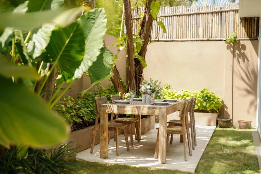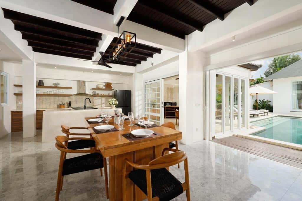 This double-pavilion tropical pool villa features five bedrooms, two living rooms, four bathrooms, an expansive courtyard with an outdoor pool surrounded by lush greenery and a spacious dining room.