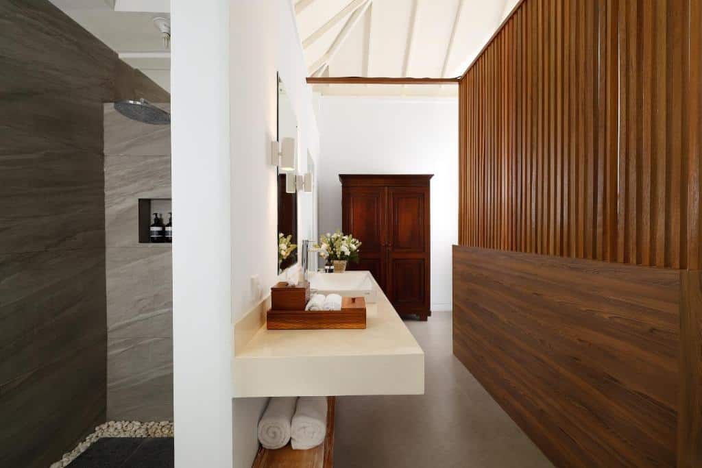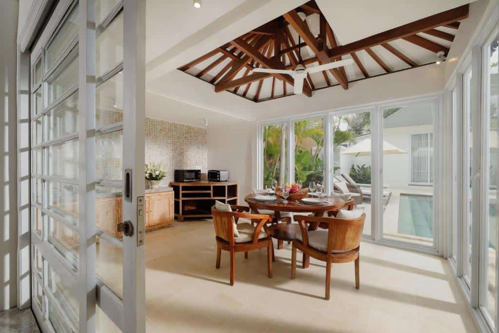 The interior décor employs hardwood timber panels with marble flooring, complemented by stylish furnishing. Highlighting the double-storey pavilion is the traditional Balinese thatched roof on the second floor, blending harmoniously with the dazzling white bedroom interior.