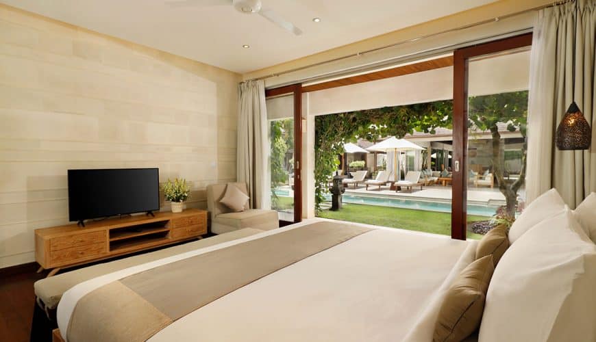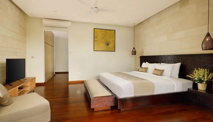 The main living pavilion and a sizable portion of the ground floor are occupied by the two master bedrooms of Villa Tenang, both of which have doors leading to the pool and garden.