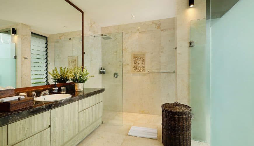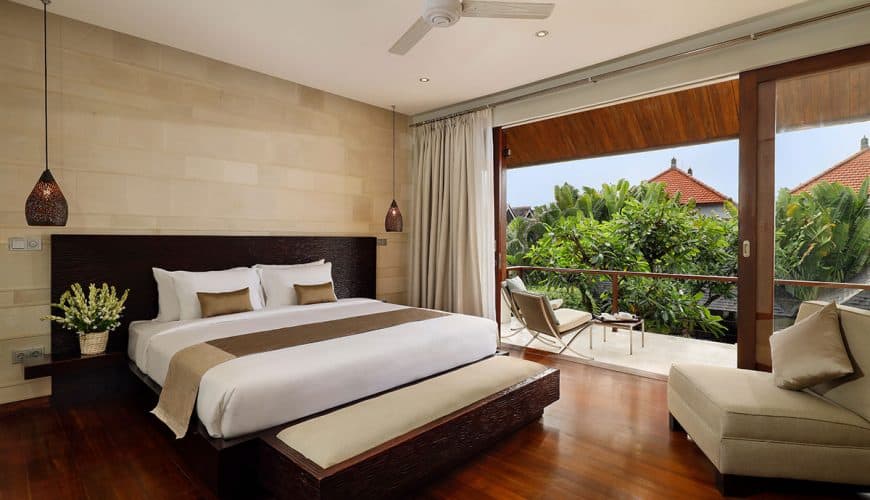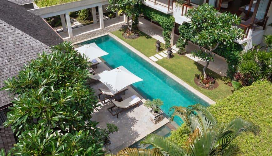 On the upper floor are two guest bedrooms that have access to a balcony and overlook the serenity of the pool villa.