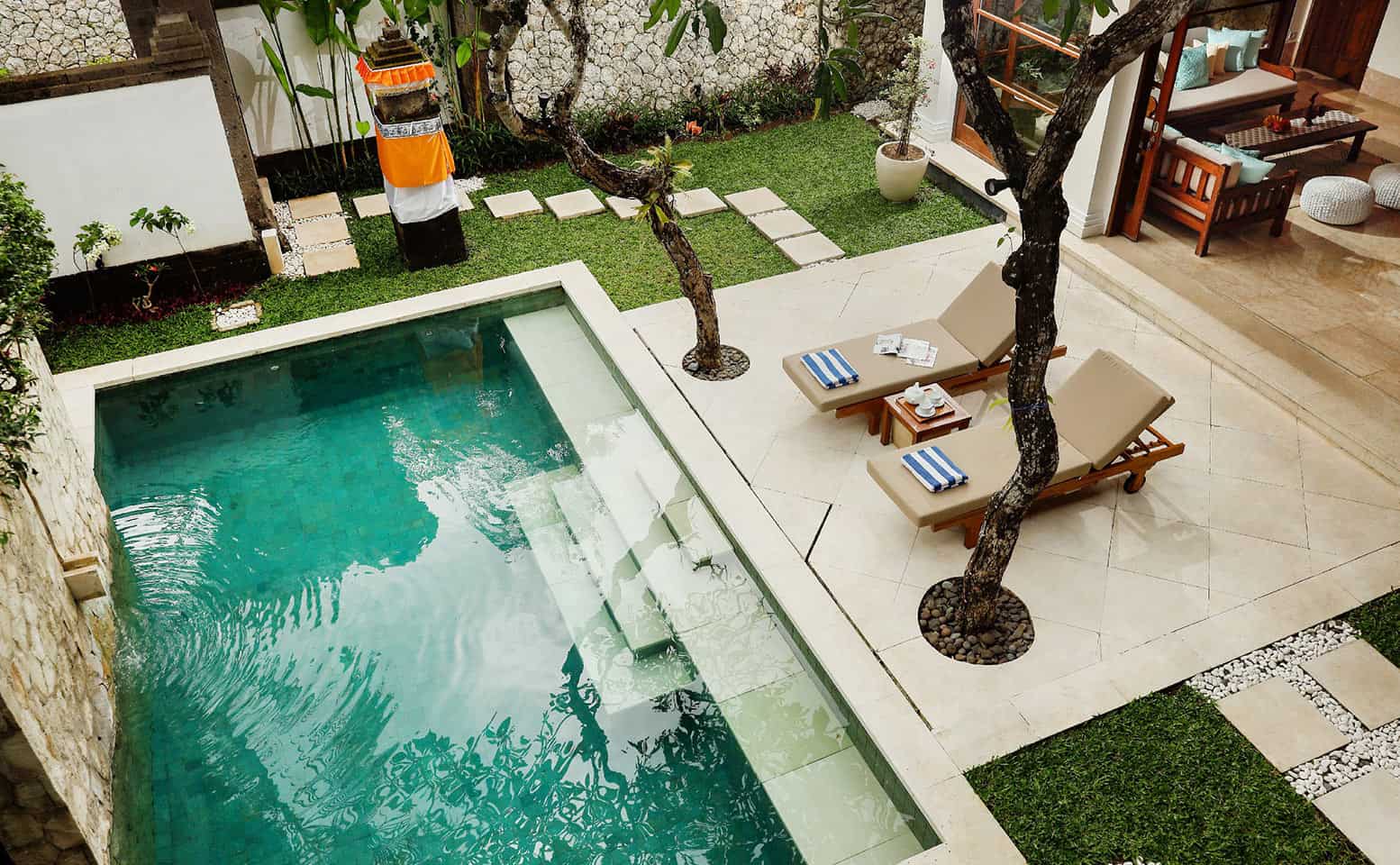 A high thatched roof made from native plants, “alang alang”, feature extensively, complemented by stylish natural interiors and contemporary comforts. The master bedroom features an interconnecting kids’ room that occupies the entire second floor. The outdoor pool surrounded by thick tropical foliage is simply irresistible. The famous Jimbaran seafood bay is within walking distance.