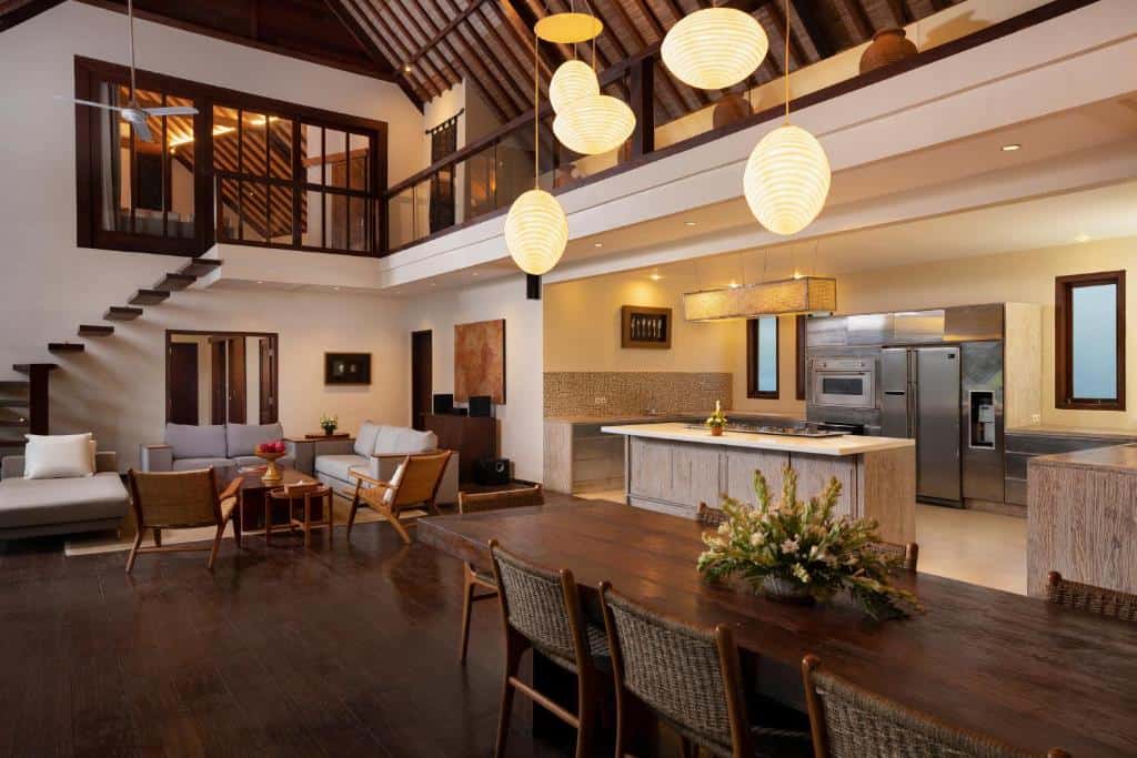 The indoor living spaces are furnished with a plush taupe sofa, a low-lying coffee table, and an audio set. Beside it, is the formal dining area with a teak table accommodating 10.