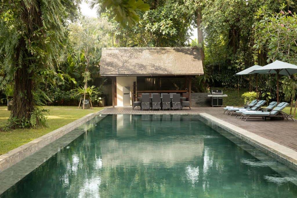 The setting is characterized with its darkly stained wooden panels, hovering stairs, sleek contemporary and open plan living design. The golden-lit spaces oversee the glistening 25-meter private pool and freshly manicured lawn. As its aquamarine waters glisten beneath the tropical sun, guests can lounge about in 8 camel-toned sun loungers and shady poolside umbrellas.
