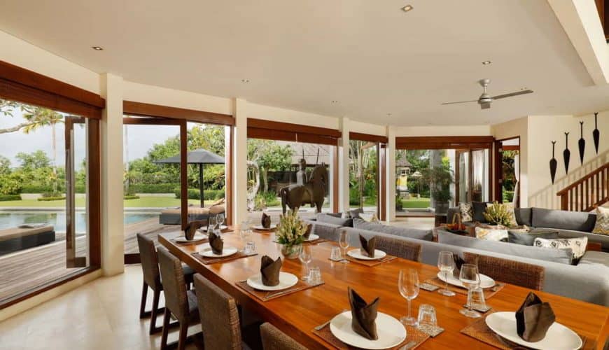 A solid wood dining table for 10 guests stands nearby. From the living room, expansive floor-to-ceiling glass doors lead to the pool deck and offer panoramic garden views.