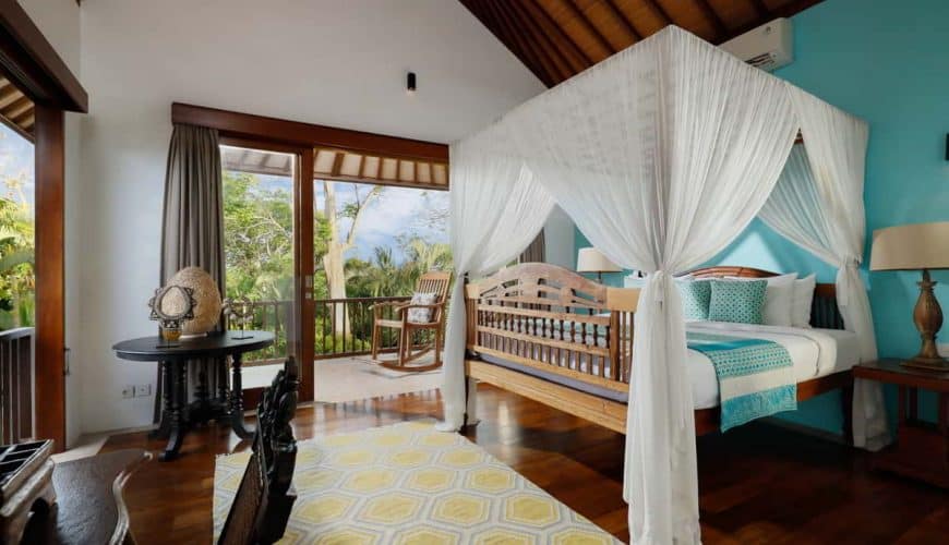 Uma Nina offers six beautiful, air-conditioned bedrooms. The main house ground floor has a stunning master bedroom with a king-sized four-poster bed, en-suite bathroom with shower and natural stone bathtub and a secret garden with its own private Bali.