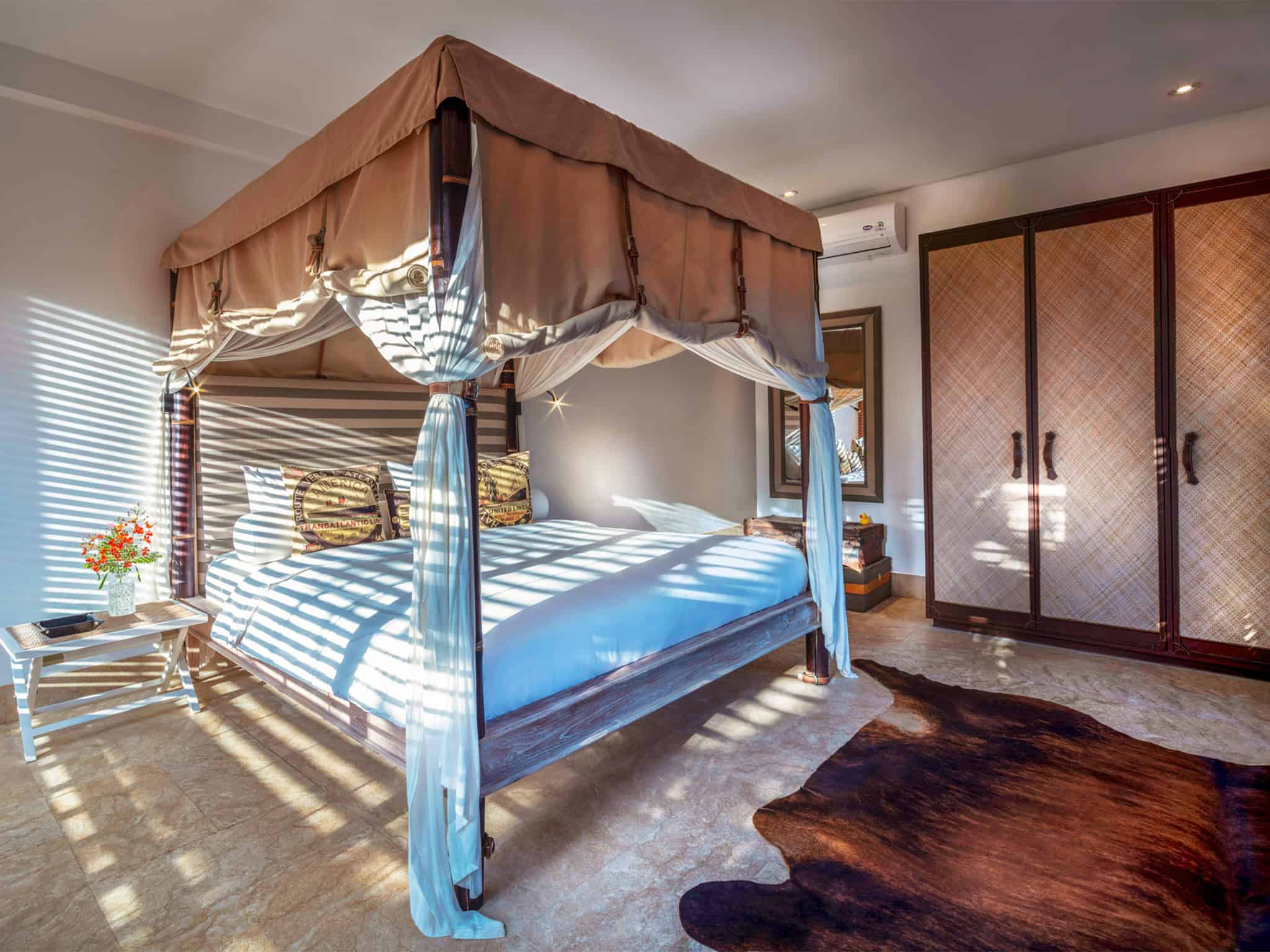 Tented Safari-themed room with queen-sized bed under a tented canopy with leather trim with air-conditioning and ceiling fan, dressing room