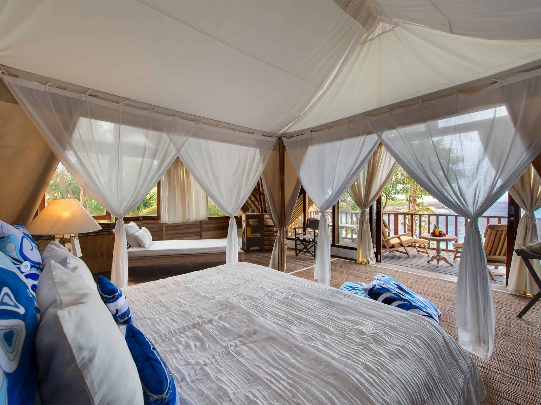Tented Safari-themed room with queen-sized bed under a tented canopy with air-conditioning and ceiling fan