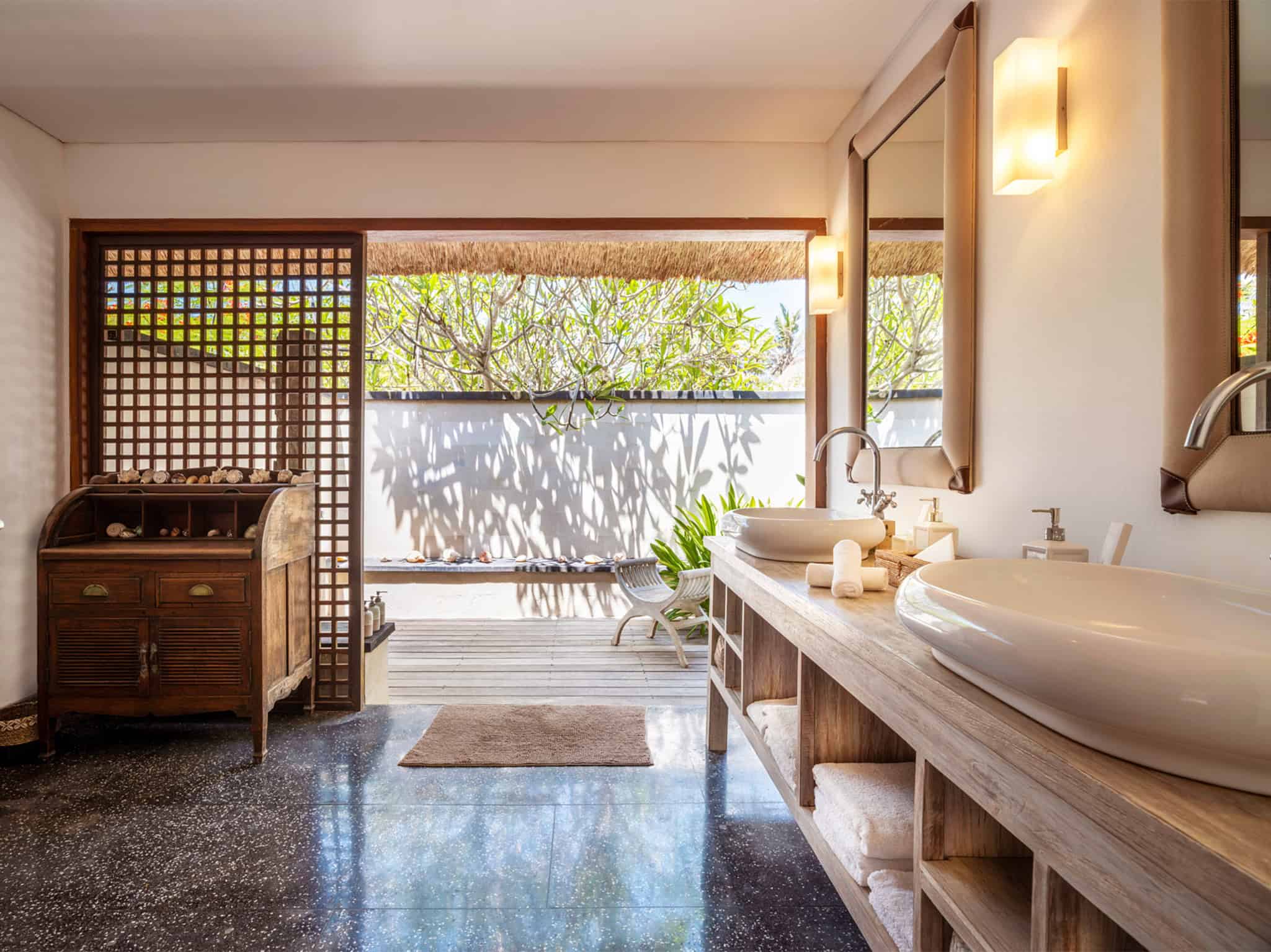Semi-outdoor ensuite bathroom with rattan and leather wardrobes, double basins – set in a patio with open-air shower