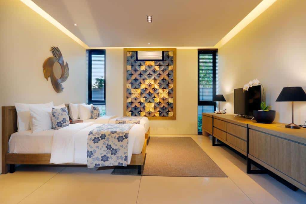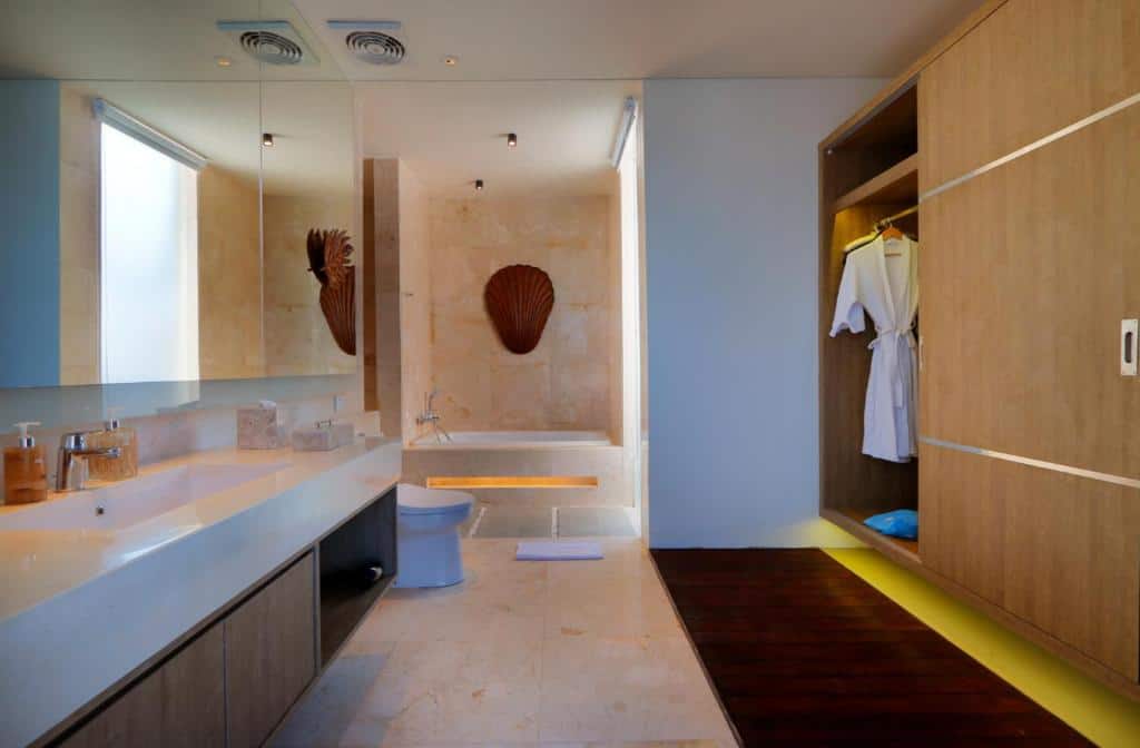 The fourth bedroom, also on the upper floor, offers a king-sized bed with air conditioning and built-in wardrobes. The ensuite bathroom is modern and well-appointed, typically with both a bathtub and a shower, resort-level amenities, and stylish finishes. It shares a bathroom with Bedroom 3 or has a bathroom that serves both upstairs rooms.